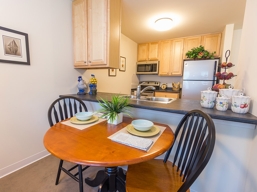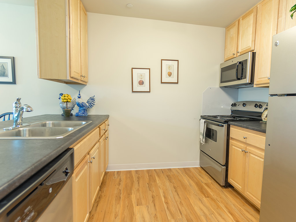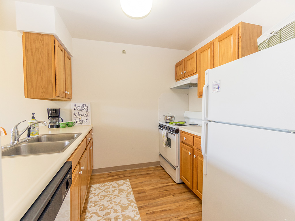 One or two-bedroom apartments include an open floor plan with kitchen, living/dining room, and spacious bathroom. The kitchens are equipped with white or clean steel GE appliances: 4-burner stove, refrigerator and dishwasher. Other features include maple cabinets, breakfast bar (some units), and individually controlled heat. Laundry machines are available on each floor, as well as storage lockers and air conditioning for an additional fee. Optional upgrades include tub-to-shower conversion, micro-wave over the stove, new lighting, new counters, new appliances.